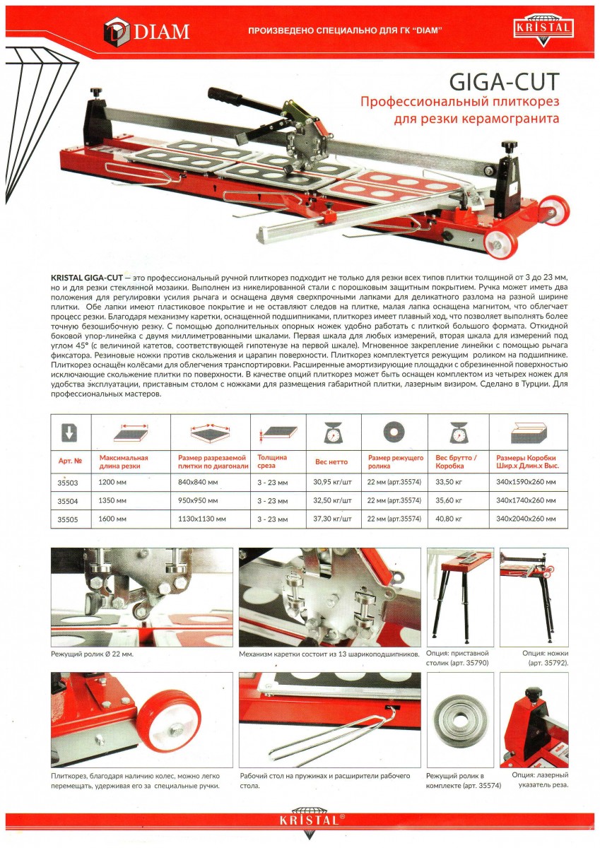 Монорельсовый ручной плиткорез KRISTAL GIGA-CUT 1200 известен по всей Европе среди плиточников. Его применяют для стеклянной мозаики и разных видов плитки, которые имеют толщину от 3 до 23 мм.
