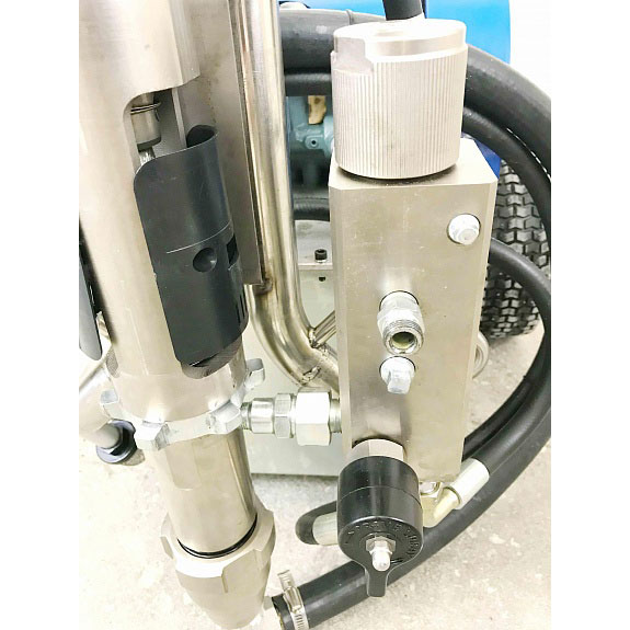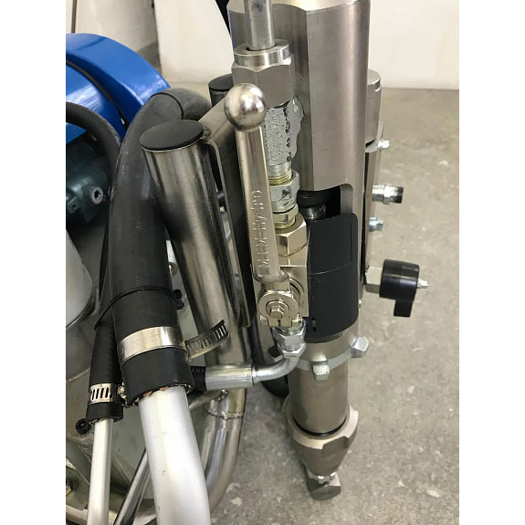 Производительность данного оборудования составляет 10,5 л/час, это позволяет проводить работы одновременно двум малярам. Для комфортного передвижения агрегата по площадке имеется перекаточная телега с широкими колесами.